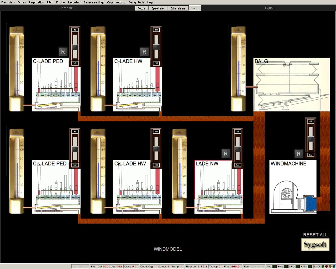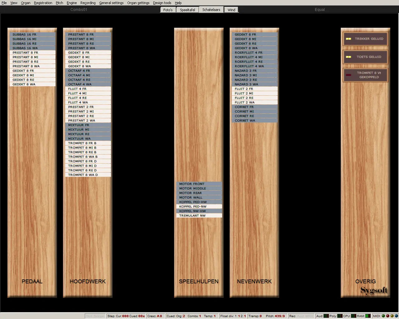 Op dit tabblad een vereenvoudigde weergave de manualen en de registers